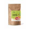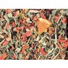 kousky jablek, mrkvové vločky, ostružinové listy, listy eukalyptu, kousky červené řepy, ibiškové květy, citrónová tráva, aroma, mrazem sušené mandarinky, pomerančové plátky